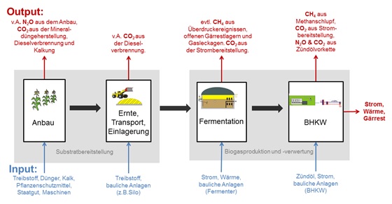 Der landwirtschaftliche Betriebszweig Biogas ist untergliedert in die Substratbereitstellung (Anbau, Ernte, Transport, Lagerung) sowie den Betrieb der Biogasanlage und des Blockheizkraftwerks (BHKW) zur energetischen Wandlung des erzeugten Biogases (Verbrennungsmotor-BHKW, evtl.: Aggregat zur Wärme-Nachverstromung). Mit dem "THG-Rechner" werden alle wesentlichen Ströme von Treibhausgasen entlang der "Biogaskette" quantifiziert (siehe Abbildung).